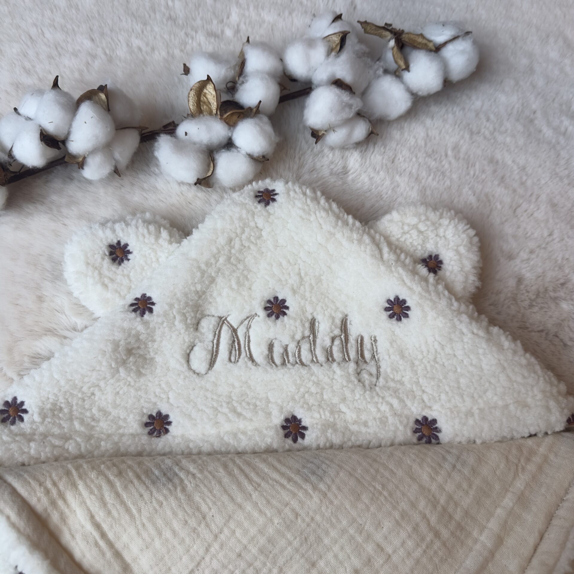 Onze superzachte wikkeldoek geborduurd met naam, ook wel teddycape genoemd, is speciaal ontworpen voor de allerkleinsten en biedt het ultieme comfort en warmte. Gemaakt van heerlijk zachte teddystof aan de buitenkant en gevoerd met 100% katoenen mousseline aan de binnenkant, is deze omslagdoek perfect om je kindje in te wikkelen voor buitenavonturen of een knusse dag thuis. De combinatie van deze hoogwaardige stoffen zorgt ervoor dat je baby zich altijd comfortabel en geborgen voelt, terwijl de wikkeldeken ook nog eens stijlvol en praktisch is.