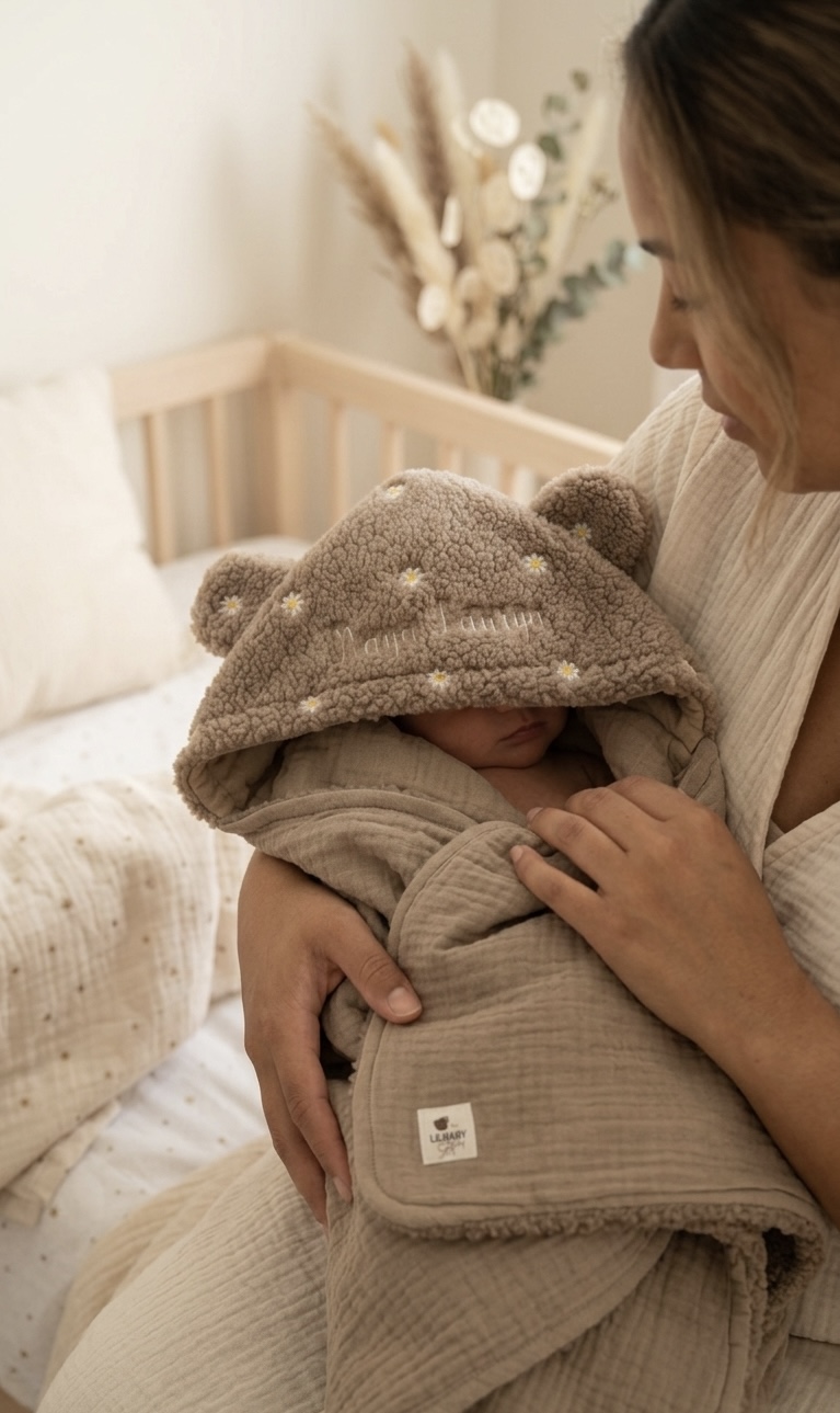 Onze superzachte wikkeldoek geborduurd met naam, ook wel teddycape genoemd, is speciaal ontworpen voor de allerkleinsten en biedt het ultieme comfort en warmte. Gemaakt van heerlijk zachte teddystof aan de buitenkant en gevoerd met 100% katoenen mousseline aan de binnenkant, is deze omslagdoek perfect om je kindje in te wikkelen voor buitenavonturen of een knusse dag thuis. De combinatie van deze hoogwaardige stoffen zorgt ervoor dat je baby zich altijd comfortabel en geborgen voelt, terwijl de wikkeldeken ook nog eens stijlvol en praktisch is.